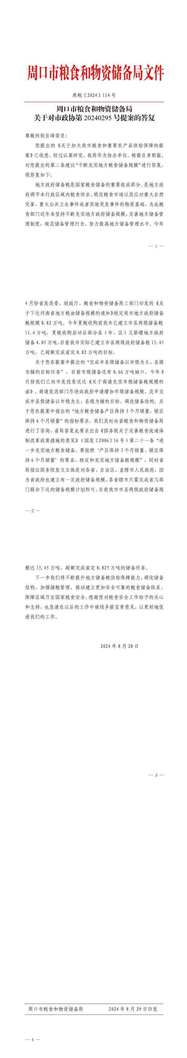 周口市粮食和物资储备局关于对市政协第20240295号提案的答复